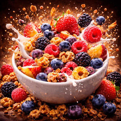 A vibrant breakfast-style blend combining sweet mixed berries with crunchy cereal notes and a light sugary finish. Bright fruit meets toasted grain for a nostalgic, full-bodied flavour experience.